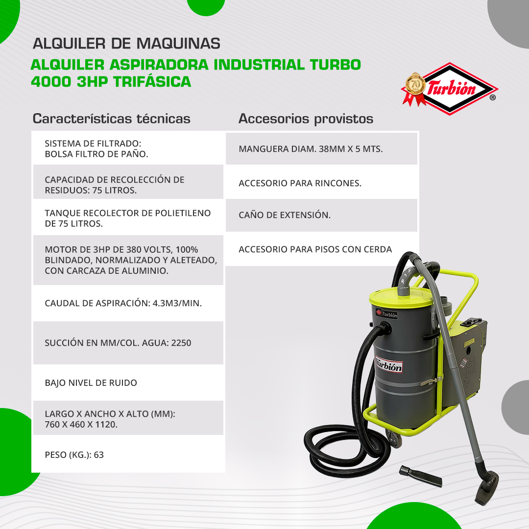 *Los accesorios disponibles incluidos son, accesorio para pisos, alfombras, rincones, manguera, caño de extensión, cepillo de lavar pisos, de lavar alfombras, de lustrar, disco de arrastre y 1 paño a elección, manopla lavatapizados, plato portaligas, plato para metales y resinoides. Según el equipo alquilado.