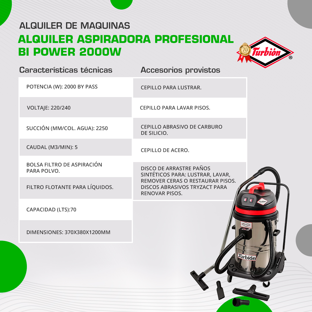 *Los accesorios disponibles incluidos son, accesorio para pisos, alfombras, rincones, manguera, caño de extensión, cepillo de lavar pisos, de lavar alfombras, de lustrar, disco de arrastre y 1 paño a elección, manopla lavatapizados, plato portaligas, plato para metales y resinoides. Según el equipo alquilado.