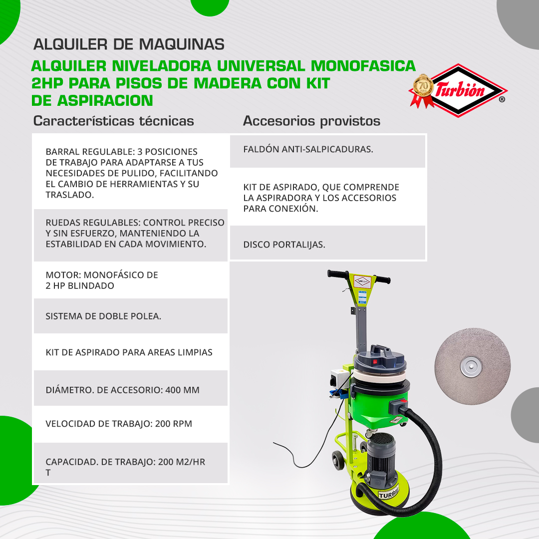 ALQUILER NIVELADORA UNIVERSAL MONOFASICA 2HP PARA PISOS DE MADERA CON KIT DE ASPIRACION
