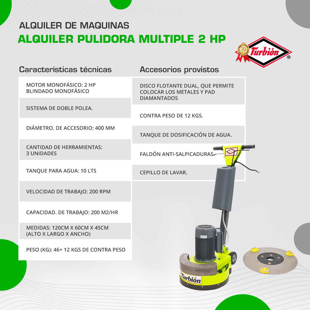*Las Pulidoras TURBION, son la herramienta indicada para realizar todo tipo de trabajo de Pulido, Restauración, reparación y Limpieza de pisos. Trabajan sobre Madera, Porcelanato, Cemento, Hormigón, Granito, Mármol, Terrazo, etc. *La máquina alquilada irá acompañada del accesorio necesario para colocar la/s herramienta/s necesaria según el trabajo que desee realizar el locador. *Los accesorios opcionales incluidos son: Plato porta lijas/ Plato Dual para Metales y Resinoides/Plato porta paños/Cepillo de lavar pisos/Cepillo para lavar alfombras/Cepillo para lustrar. *Los accesorios adicionales son: Cepillo abrasivo de carburo de silicio/Cepillo abrasivo de acero/Paños de fibra para lustrar, lavar, remover/Metales de desbaste/Resinoides de Pulido/Químicos para proceso de pulido, limpieza y abrillantado. *El precio del alquiler es por día y se toma desde la hora de entrega del equipo, hasta su devolución. *El contrato de Alquiler se firma en fábrica. Sin excepciones. *El firmante por parte del Locador; si es empresa, titular o apoderado con documentación que acredite. Si es persona física, DNI. *Como Garantía se requiere una Tarjeta de crédito con crédito mínimo $2.000.000. *Las herramientas que acompañen a la máquina se abonan antes del retiro de fábrica. *En caso de rotura, pérdida o perjuicio del equipo alquilado se cobrará el arancel correspondiente utilizando el crédito de la tarjeta dejada en garantía. *En el contrato se declara con qué accesorios se entrega el equipo y en caso de rotura o faltante a la devolución, se ejecutará la garantía. *En caso de no devolver el equipo en tiempo y forma acordada, se cobrará el tiempo adicional.