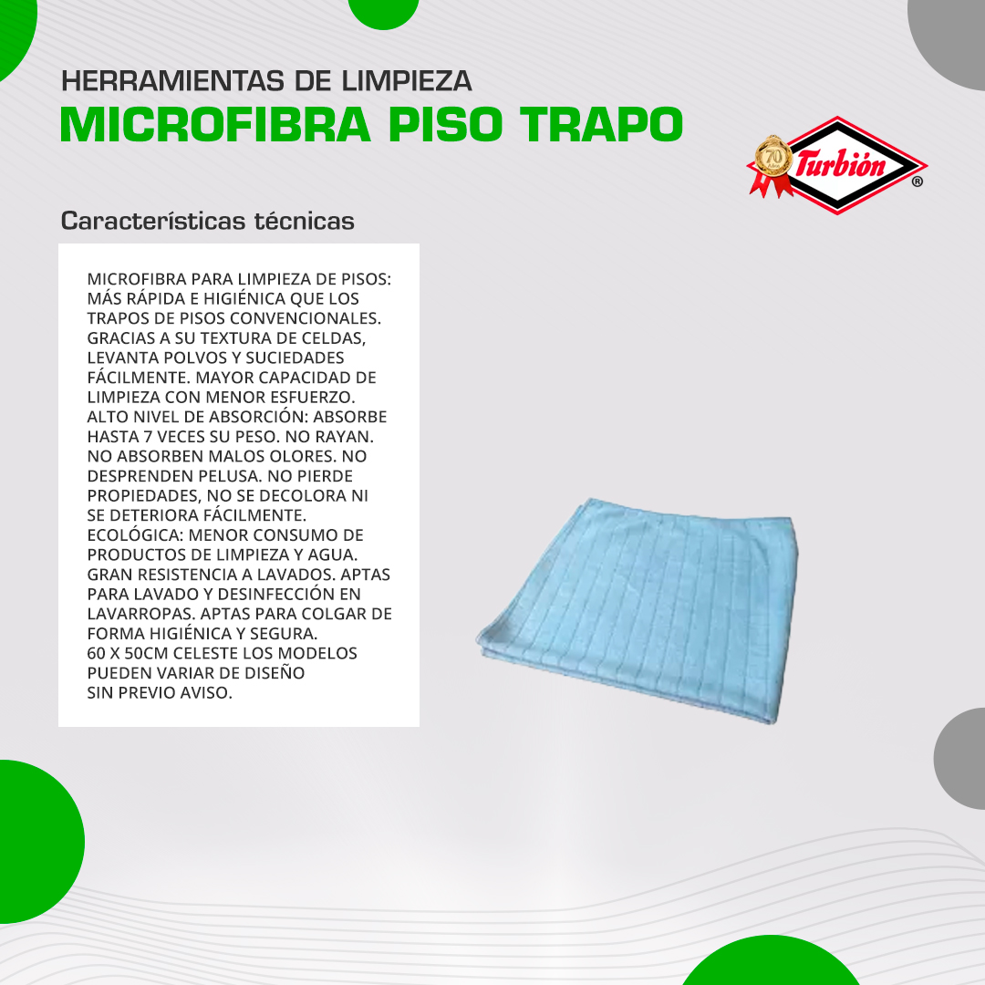 microfibra para limpieza de pisos: más rápida e higiénica que los trapos de pisos convencionales. Gracias a su textura de celdas, levanta polvos y suciedades fácilmente. Mayor capacidad de limpieza con menor esfuerzo. Alto nivel de absorción: absorbe hasta 7 veces su peso. No rayan. No absorben malos olores. No desprenden pelusa. No pierde propiedades, no se decolora ni se deteriora fácilmente. Ecológica: menor consumo de productos de limpieza y agua. Gran resistencia a lavados. Aptas para lavado y desinfección en lavarropas. Aptas para colgar de forma higiénica y segura. 60 X 50CM CELESTE Los modelos pueden variar de diseño sin previo aviso.