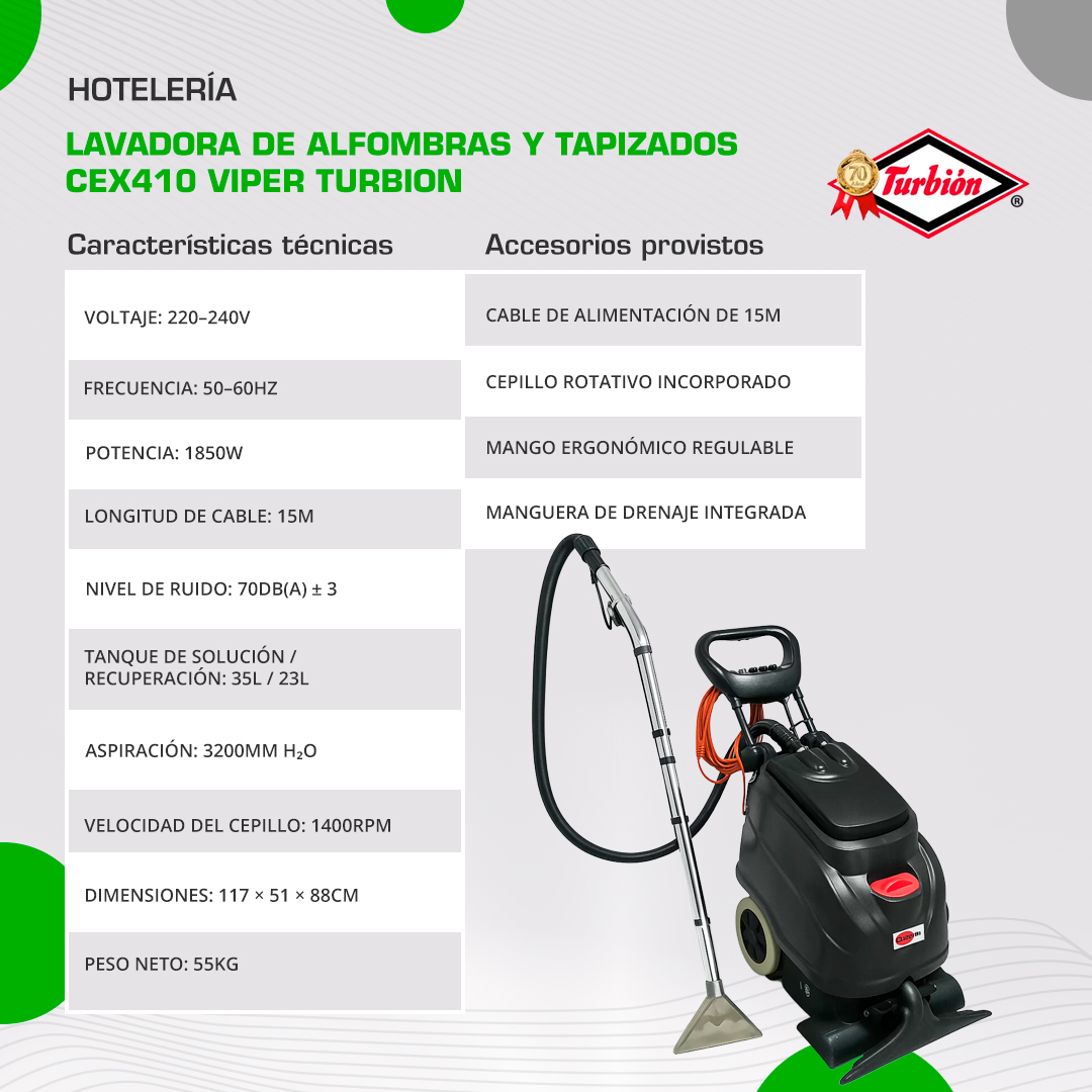 La CEX410 Viper Turbion es una lavadora de alfombras y tapizados compacta, eficiente y de alto rendimiento, diseñada para una limpieza intensiva y profesional. Su sistema de inyección-extracción permite una aplicación profunda del producto químico y una aspiración potente que garantiza tiempos de secado más rápidos y óptimos resultados.
