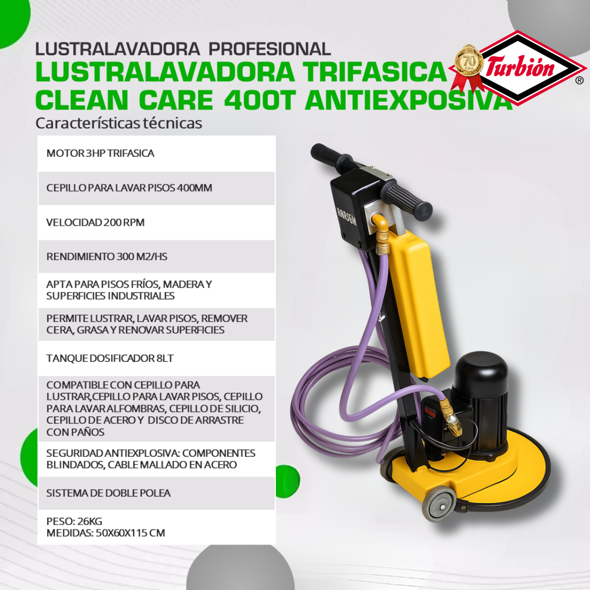 La Clean Care 400T está equipada con un motor trifásico de 3HP y componentes eléctricos totalmente blindados y antiexplosivos, lo que la hace apta para operar en entornos con atmósferas potencialmente inflamables o peligrosas. Su cable con mallado de acero añade una capa extra de protección, garantizando seguridad total durante el trabajo.