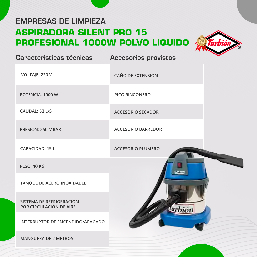 La ASPIRADORA SILENT PRO 15 es una herramienta profesional diseñada para la limpieza eficiente y silenciosa de polvo y líquido en diversos entornos, incluyendo hoteles, clínicas y establecimientos comerciales.