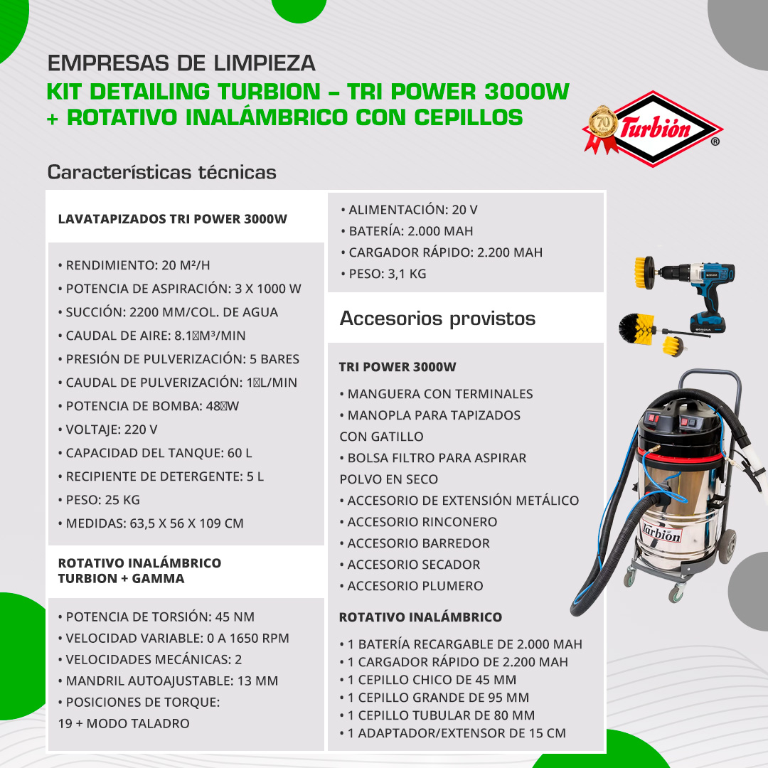 Este combo profesional fue diseñado para quienes necesitan máxima eficiencia en la limpieza profunda de interiores. El modelo Tri Power 3000W ofrece un triple sistema de aspiración (3×1000 W) combinado con una bomba inyectora de 48 W que pulveriza el producto limpiador a 5 bares, removiendo suciedad incrustada en alfombras, moquetas, tapizados e interiores de vehículos. Gracias a su gran caudal de aire (8.1 m³/min), logra resultados rápidos y homogéneos.