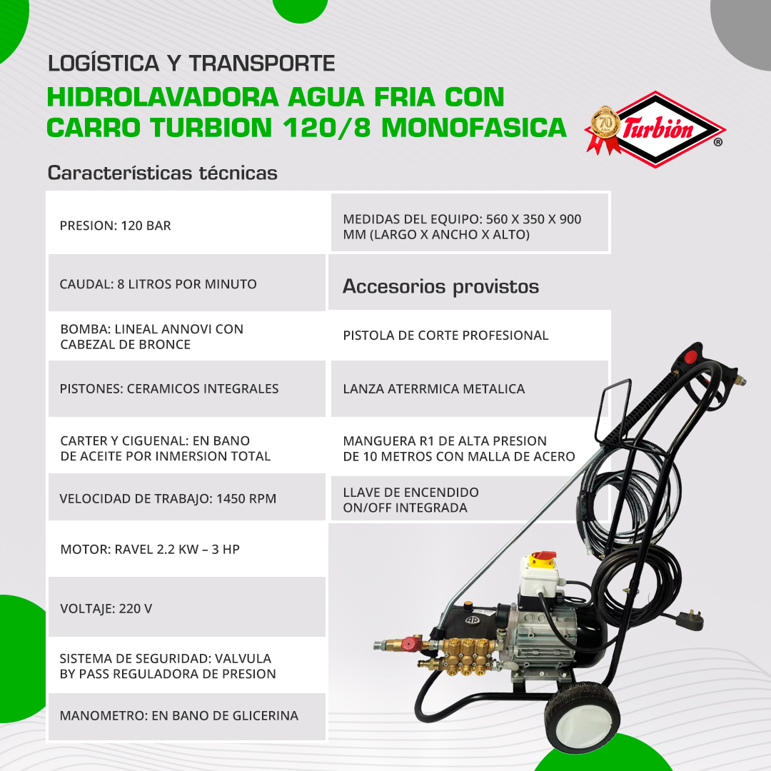 Trabaja a 1450 rpm, lo que reduce la temperatura de funcionamiento y prolonga significativamente la vida util del equipo. Su motor Ravel de 3 HP aporta un caudal constante de 8 litros por minuto y 120 bar de presion real, suficiente para remover grasa, barro, particulas incrustadas y suciedad pesada en variedad de superficies y maquinarias.