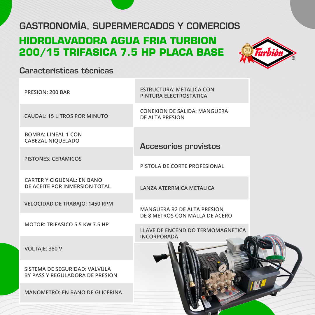 Equipada con una bomba lineal con cabezal niquelado y pistones ceramicos, opera a 1450 rpm para extender la vida util del conjunto mecanico. Su motor trifasico blindado de 7.5 HP entrega 200 bar constantes y un caudal de 15 litros por minuto, ideales para remover suciedad pesada, grasa, barro y residuos adheridos sin perdida de rendimiento.