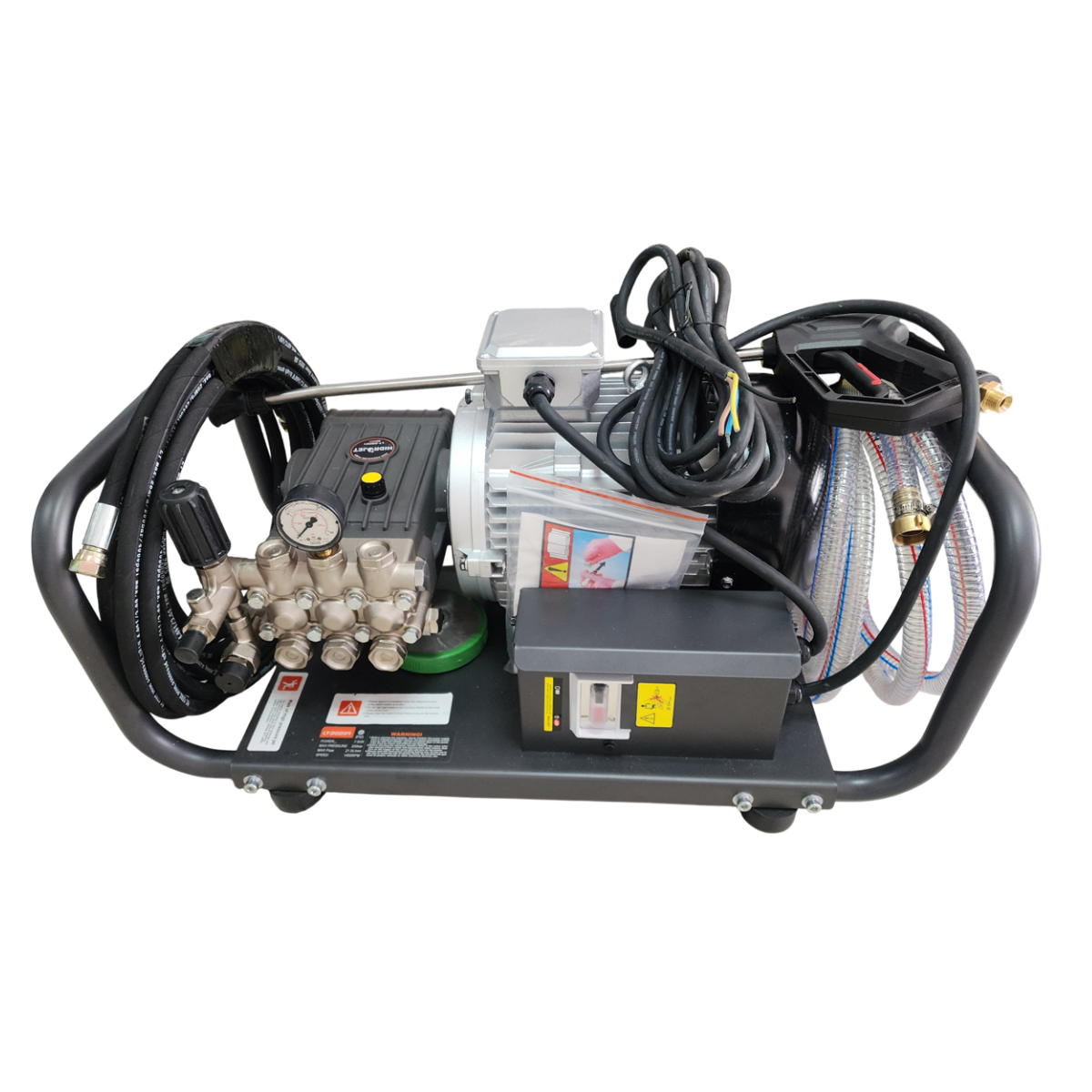 Equipada con una bomba lineal de alta calidad con cabezal niquelado y pistones ceramicos integrales, opera a 1450 rpm para prolongar la vida mecanica del conjunto. Su motor trifasico blindado de 10 HP entrega 200 bar de presion constante y un caudal elevado de 21 litros por minuto, permitiendo limpiar maquinaria pesada, superficies grandes, grasa industrial, barro compactado y suciedad profunda sin perdida de rendimiento.