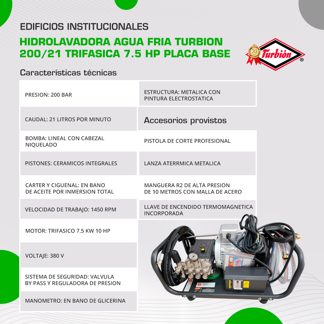 Equipada con una bomba lineal de alta calidad con cabezal niquelado y pistones ceramicos integrales, opera a 1450 rpm para prolongar la vida mecanica del conjunto. Su motor trifasico blindado de 10 HP entrega 200 bar de presion constante y un caudal elevado de 21 litros por minuto, permitiendo limpiar maquinaria pesada, superficies grandes, grasa industrial, barro compactado y suciedad profunda sin perdida de rendimiento.