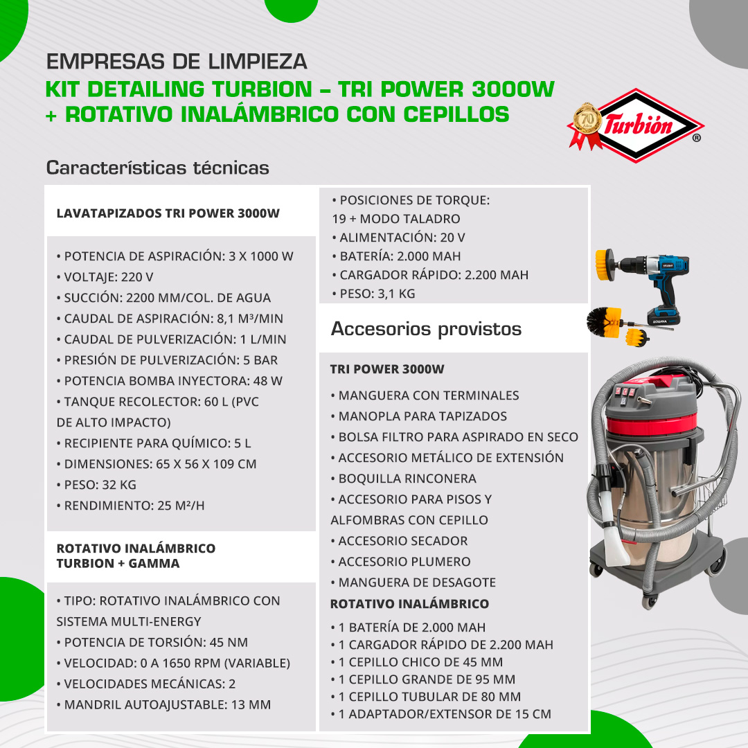 Este combo fue desarrollado para profesionales que buscan el máximo rendimiento en limpieza de superficies textiles. El equipo Tri Power 3000W ofrece triple motor de aspiración, sistema de inyección-extracción de alta presión, bomba inyectora profesional y tanque de gran capacidad. Su estructura está diseñada para uso intensivo, con materiales resistentes y detalles que optimizan el trabajo: manguera de desagote, ruedas industriales y excelente capacidad de trabajo continuo.