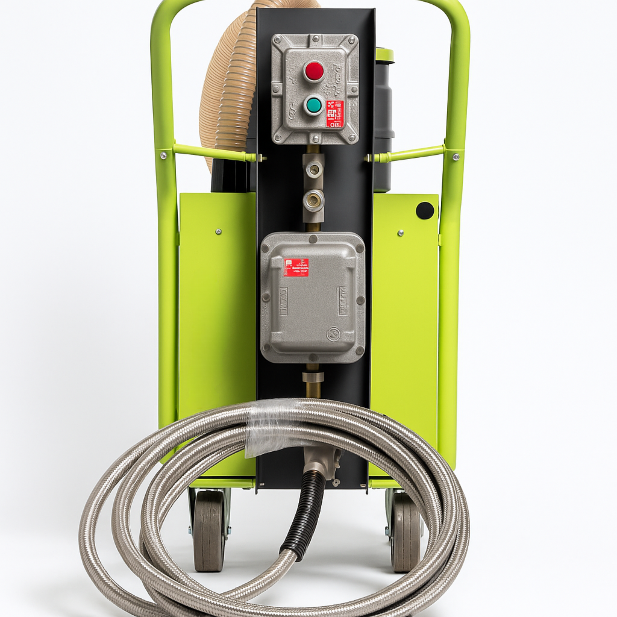 Además, su estructura de acero tratada con pintura epoxi bicapa y su cable ANTI-EXPLOSIVO, junto con una protección térmica para el motor, aseguran una larga vida útil y máxima seguridad. Esta aspiradora también cuenta con rodados industriales para su fácil traslado en planta y un diseño robusto, ideal para un uso prolongado en condiciones industriales severas.