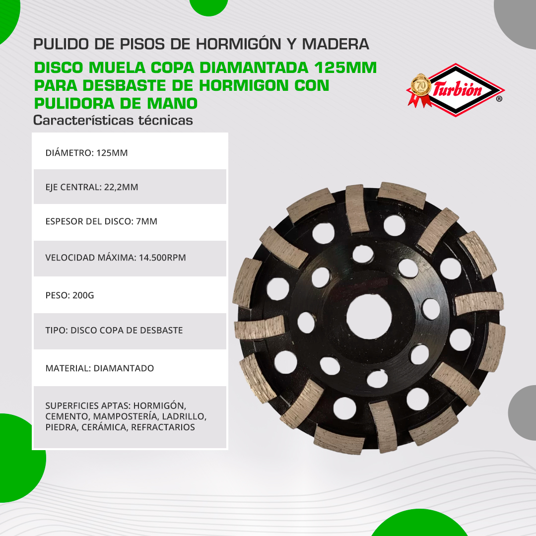 Este disco muela diamantado segmentado de 125 mm es una herramienta clave para tareas de desbaste intensivo en hormigón y superficies abrasivas. Su formato de copa doble permite una mayor superficie de contacto, optimizando la remoción de material y reduciendo tiempos de trabajo.