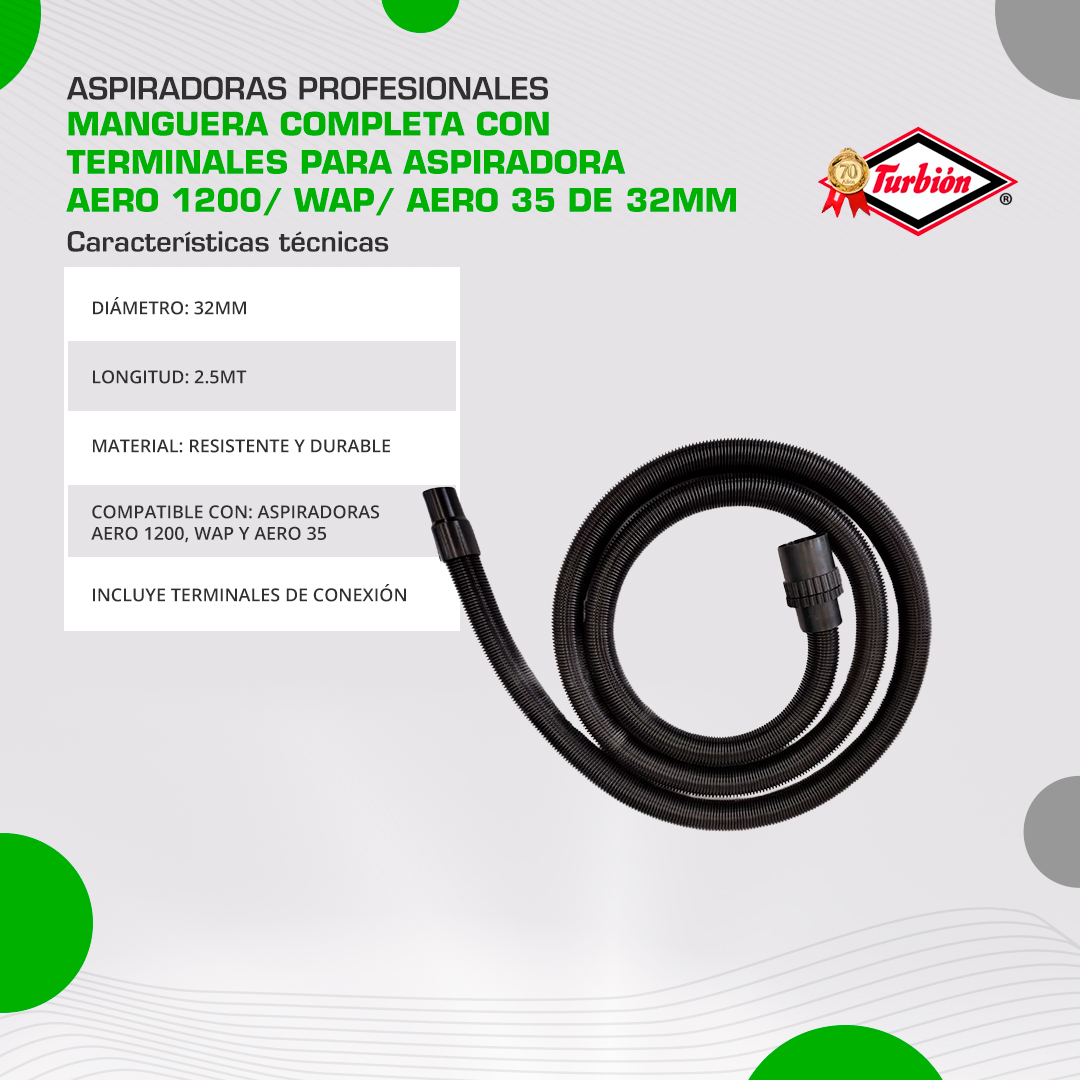 Manguera completa con terminales diseñada específicamente para aspiradoras Aero 1200, WAP y Aero 35. Cuenta con un diámetro de 32mm y está fabricada con materiales resistentes y duraderos.